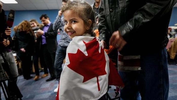 طفلة سورية لاجئة تلتف بالعلم الكندي (أرشيف).
